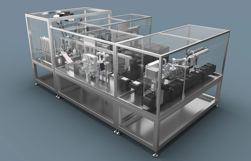 试剂卡片机械手自动堆叠10片或者25片,自动上卡盒、自动一次性装10片或者25片卡片、配重块全自动组装、自动装干燥剂、自动装限位块、自动贴RFID标,自动装袋,自动封口